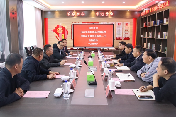 山东华瑞集团菏泽华瑞面业有限公司董事长蒋伟一行先后参观了面粉加工车间、成品仓库。双方就各自的生产经营情况和近年来面粉行业市场运行态势进行了交流。
