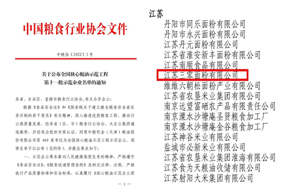 近日,中国粮食行业协会下发《关于公布全国放心粮油示范工程第十一批示范企业名单的通知》(中粮协〔2022〕3号),三零面粉公司被确定为全国放心粮油示范工程第十一批示范企业。