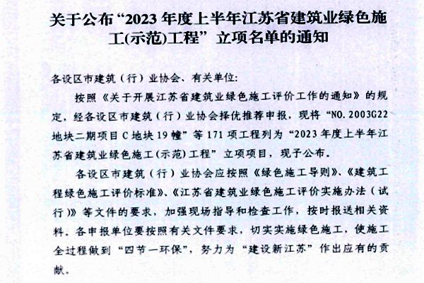 2023年7月,省建筑行业协会发文公布了“2023年度上半年江苏省建筑业绿色施工(示范)工程”的立项名单,williamhill官网淮安粮食仓储物流项目一期榜上有名,并且是淮安市唯一一家入选的项目工程。
