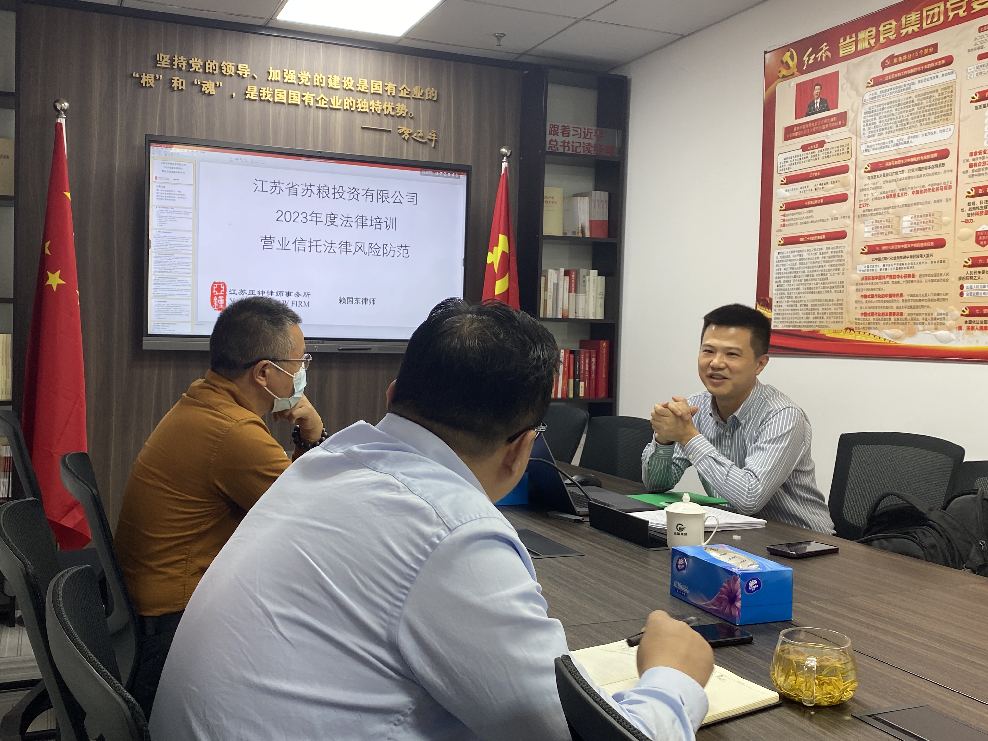 为深入学习全面贯彻习近平法治思想,持续推进“以案释法”活动的贯彻落实,提高全体员工法律风险防控意识和能力,2023年11月3日上午,邀请江苏亚钟律师事务所赖国东律师作为全体员工开展主题为“信托风险相关法律案件解读”的专题法律培训。
