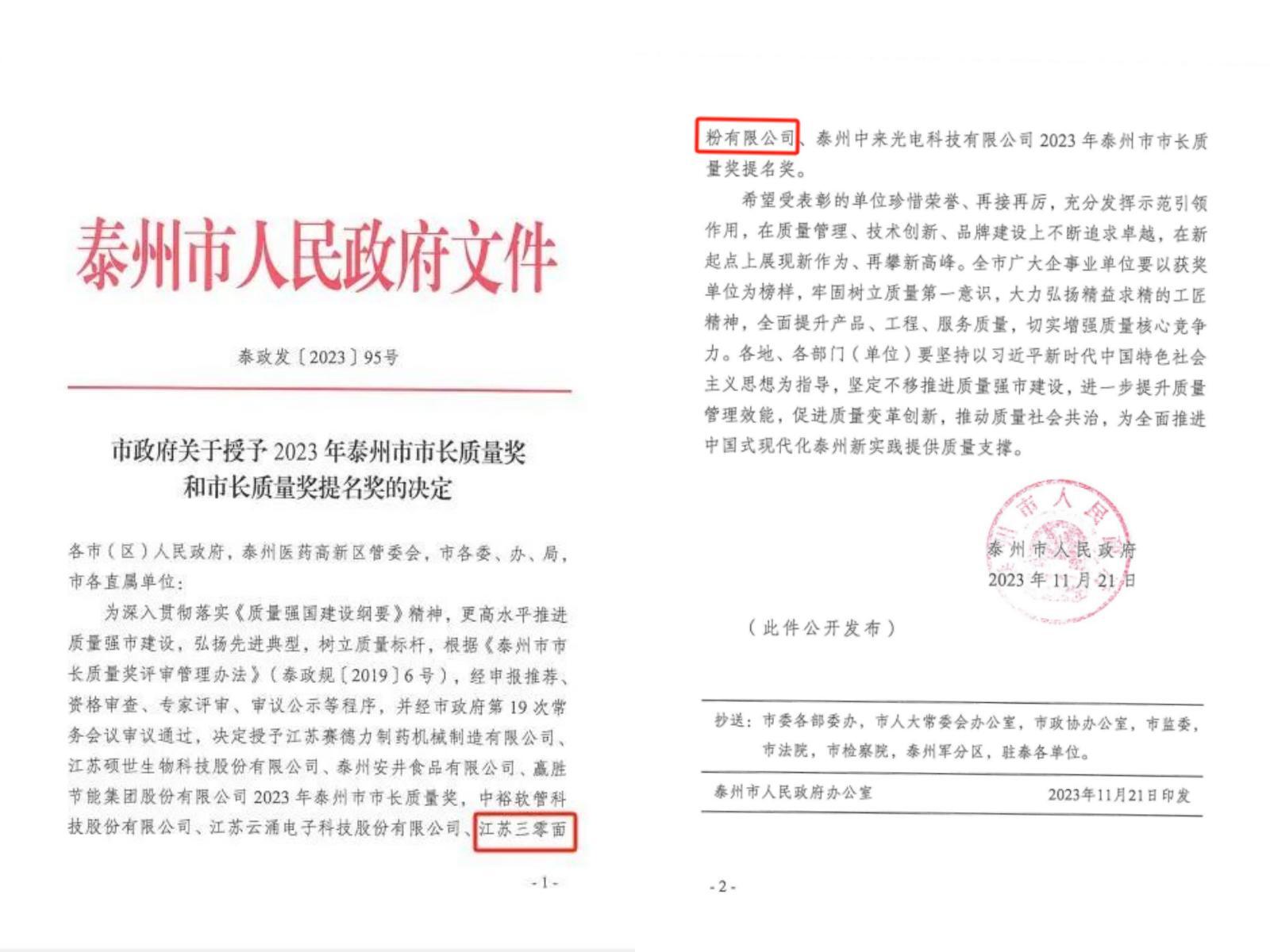 11月21日,2023年度泰州市市长质量奖获奖名单正式公布。经申报推荐、资格审查、专家评审、审议公示等程序,苏三零公司荣获2023年度泰州市市长质量奖提名奖。