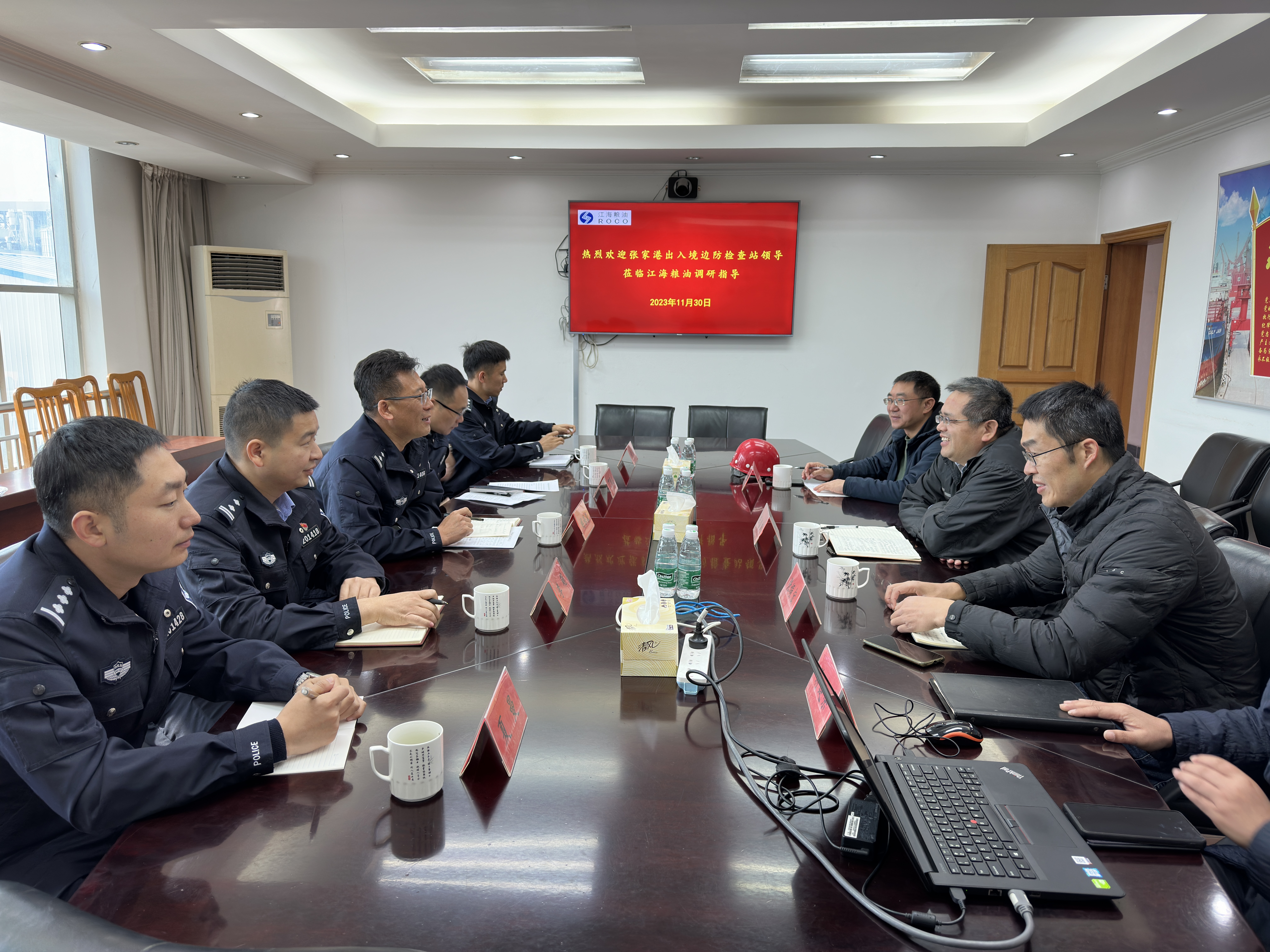 2023年11月30日上午,张家港出入境边防检查站副站长胡保森带队,到张家港产业公司专题调研在港外轮梯口协管员撤离工作。张家港产业公司安全总监王留声,以及安全环保部、生产作业部相关负责人员接待了调研组,并陪同查看了在港外轮梯口查验工作现场,详细汇报了梯口协管员管理工作情况。