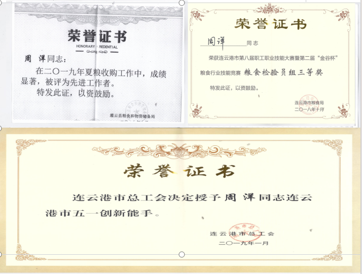 “宝剑锋从磨砺出,梅花香自苦寒来”,机遇永远属于有准备的人,正是因为这年复一年的学习钻研,才取得了一些骄人的成绩。周洋于2018年10月获得连云港市总工会颁发的“五一创新能手”荣誉称号;2019年1月获得连云港市第八届职工职业技能大赛粮食检验员组三等奖;2019年12月夏粮收购工作,获得灌云县粮食和物资储备局颁发“先进工作者”荣誉称号。