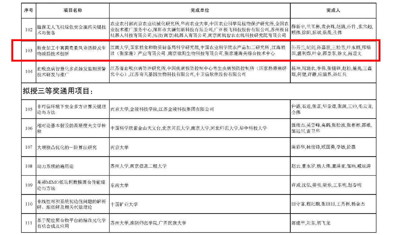 近日,省科技厅公布2023年度江苏省科学技术奖综合评审结果,由江南大学、国粮局科学研究院、中国农科院农产品加工研究院、江海粮油(张家港)产业有限公司、南京微测生物科技有限公司、张家港海关综合技术中心共同完成的“粮食加工中真菌毒素风险防控及生物减损技术创新”项目获评二等奖。
