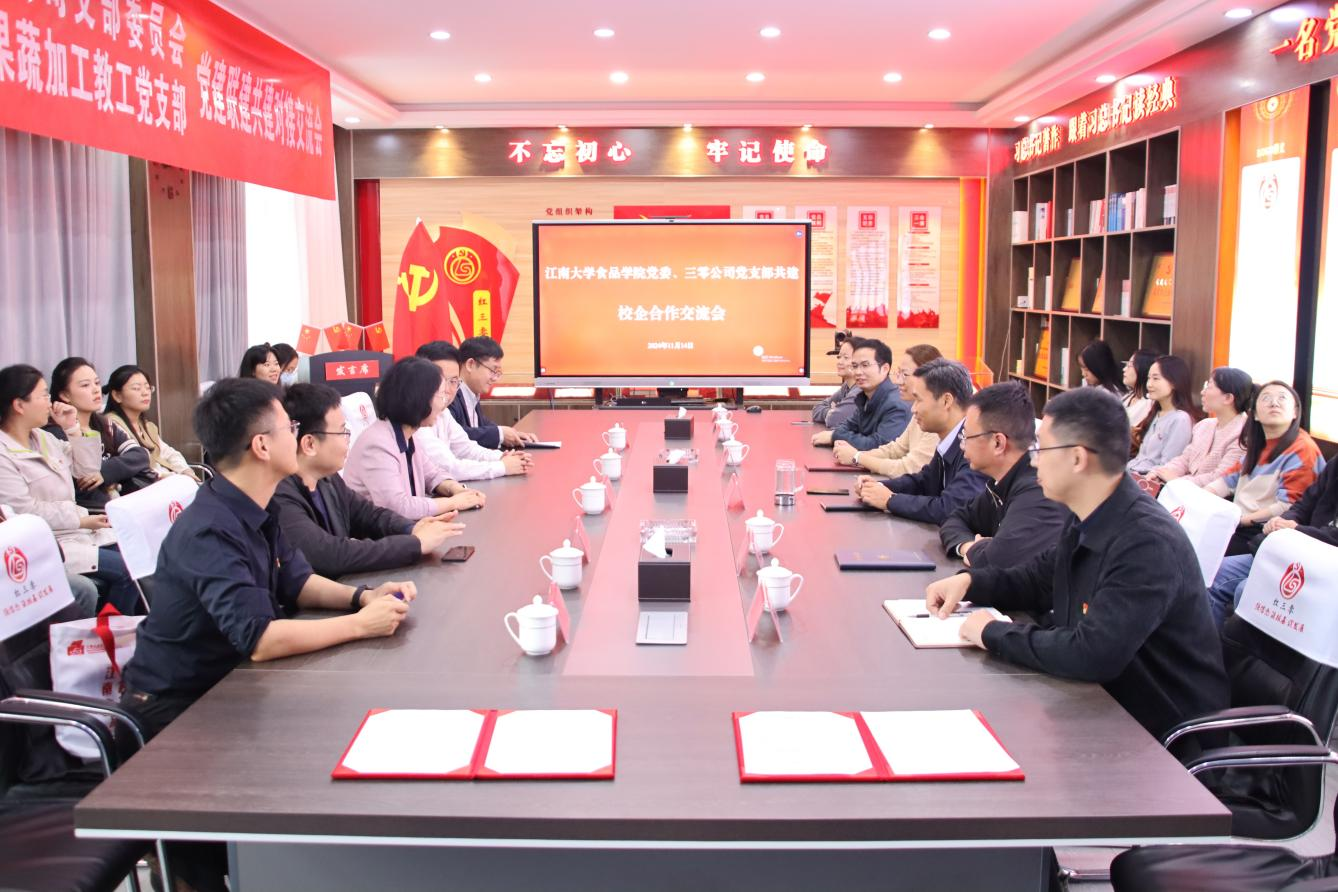 为深入贯彻落实党的二十大及二十届三中全会精神,进一步推动“优势互补、党员互动、活动互联、资源共享、合作共赢”的党建互联共建模式走深走实,深化校企合作,推进党建与业务深度融合,11月14日,三零公司党支部和江南大学食品学院党委开展校企合作交流活动。三零公司党支部书记、董事长向新跃,总经理助理蔡昉等出席活动。