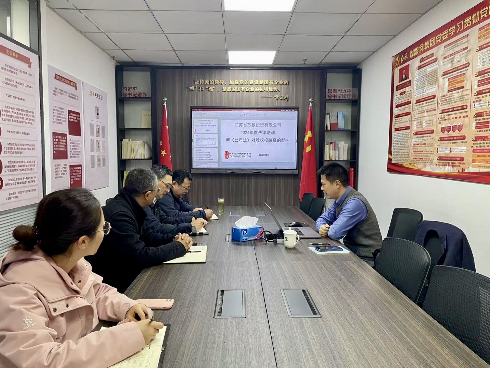 2024年12月6日,为系统学习新《公司法》对股权投融资的影响,确保员工全面把握、准确理解、主动适用,投资公司邀请江苏亚钟律师事务所赖国东律师以“新《公司法》对股权投融资的影响”为主题,为全体员工开展专题法律培训。