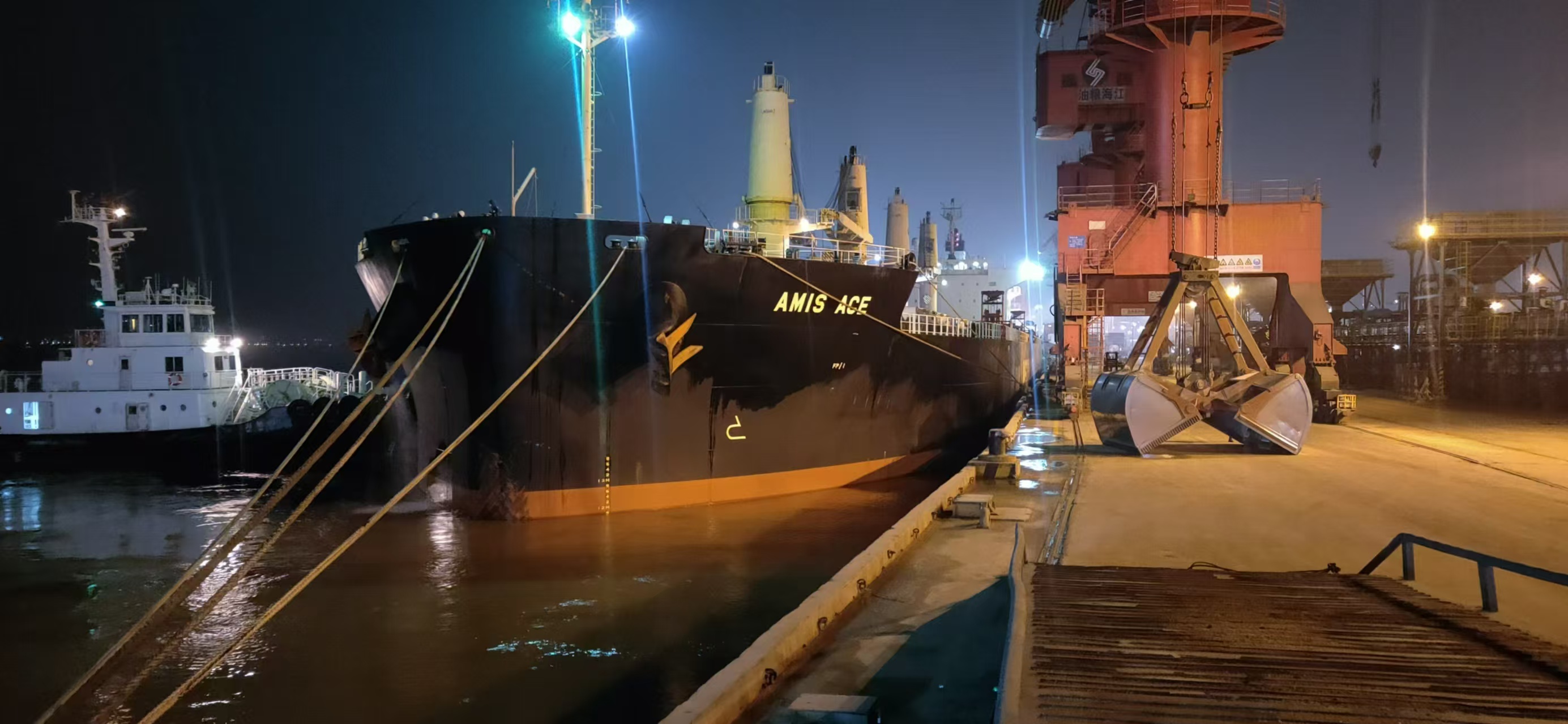 12月5日18时许,随着“艾米斯”轮缓缓驶入港口,张家港产业公司相关部门严阵以待。引航员凭借精湛的技术和丰富的经验,稳稳地操控着巨轮;拖轮在一旁全力协助,调整船身角度;码头工人早已就绪,准备接缆绳、安置防撞设施等。最终,在各方齐心协力下,“艾米斯”轮平稳地靠泊在江海粮油二号泊位。