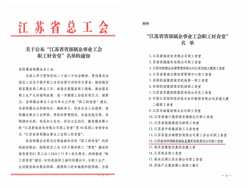近日,江苏省总工会公布了“江苏省省部属企事业工会职工好食堂”名单,集团公司所属洪泽湖库职工食堂荣誉登榜。