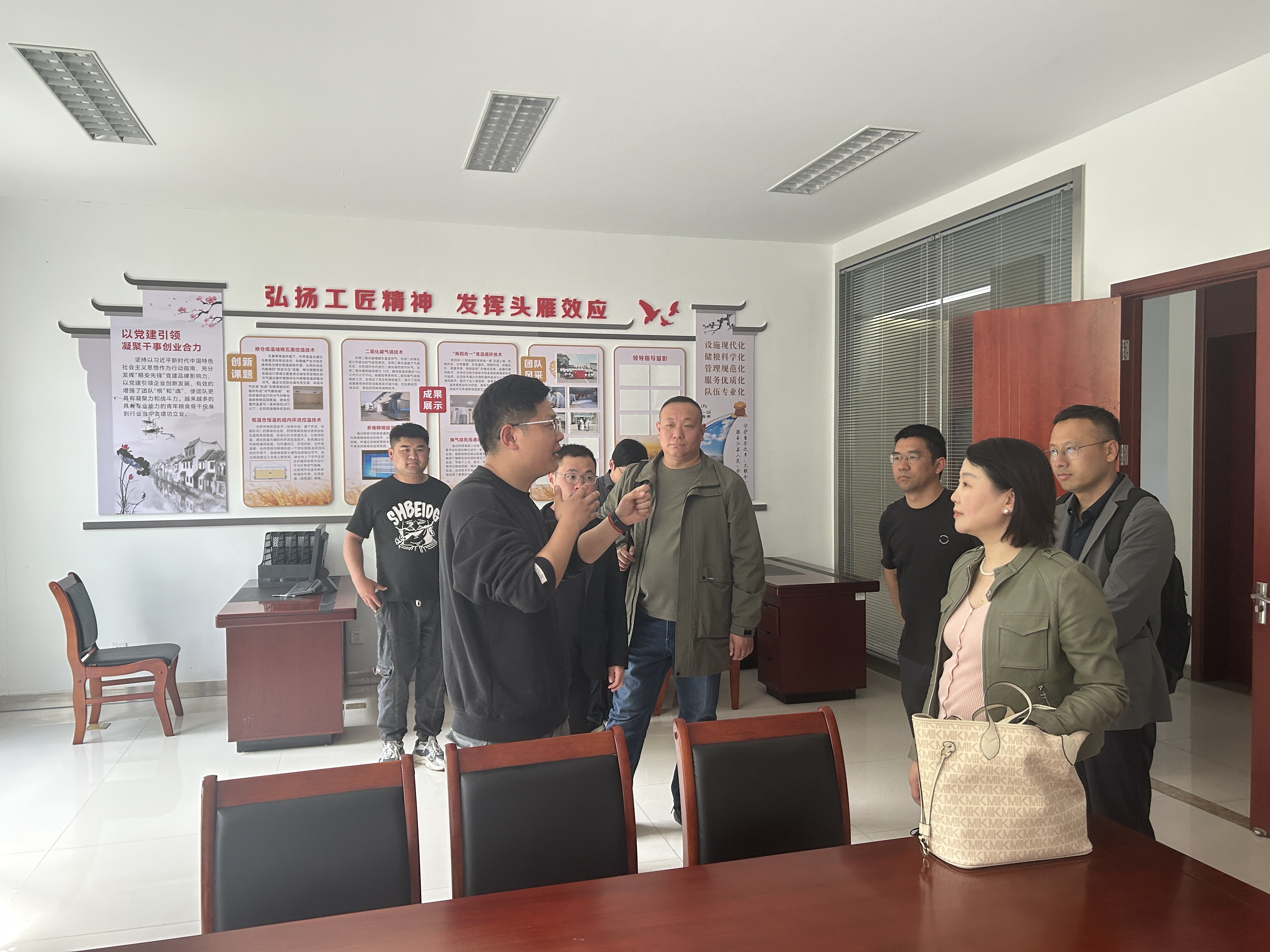 昆山库副总经理刘天宇带领农村班学员走访昆山库生产作业现场、讲解信息化科技储粮技术、参观“大师工作室”、演示“粮食质量一体化自动检测系统”,为农村班学员介绍了粮食轮换、通风降温、熏蒸杀虫等粮库工作内容,以及粮食安全与国家安全的紧密联系,希望以此警醒学员们粮食安全的重要性,并鼓励全体学员立足自身岗位,激发干事创业热情,在基层工作中勇于担责、主动担当作为。
