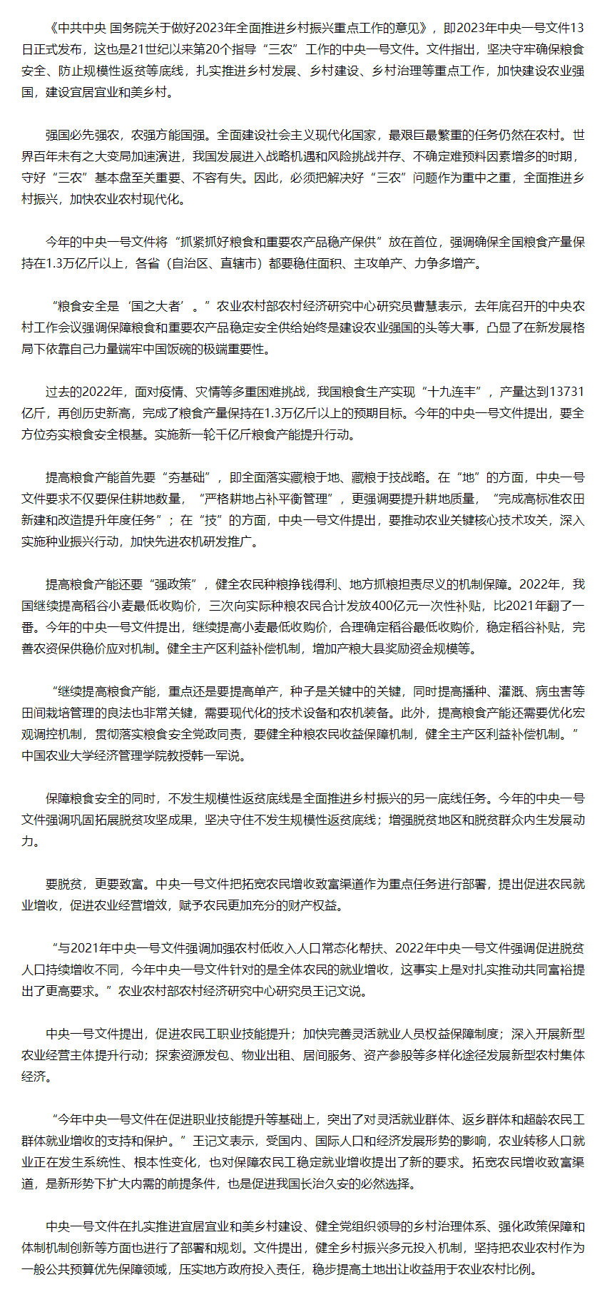 中央一号文件发布 锚定粮食安全等重点任务