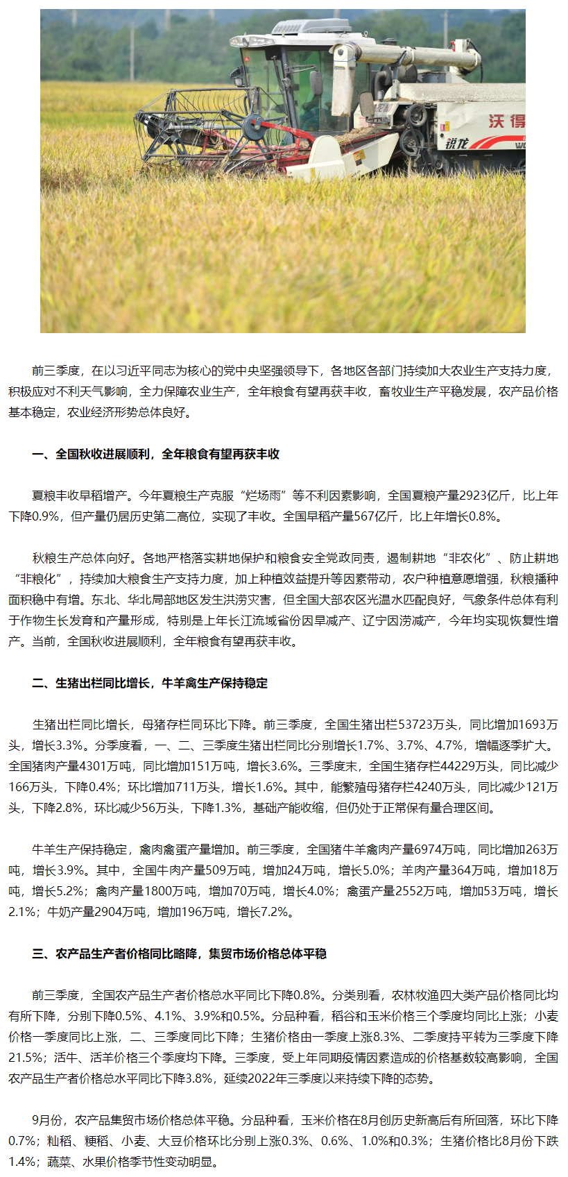农业经济形势总体良好 全年粮食有望再获丰收