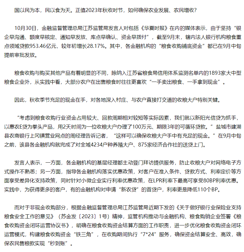 江苏各金融机构“粮食收购铺底资金”已提前审批发放