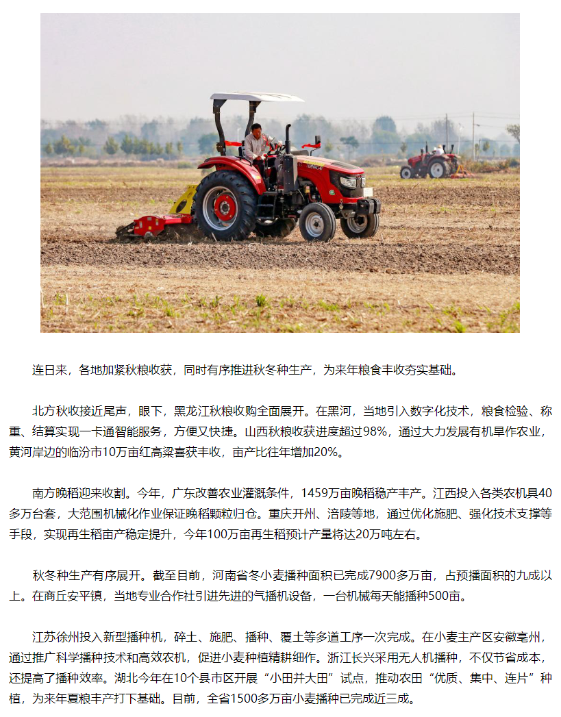 各地加紧秋粮收获有序推进秋冬种