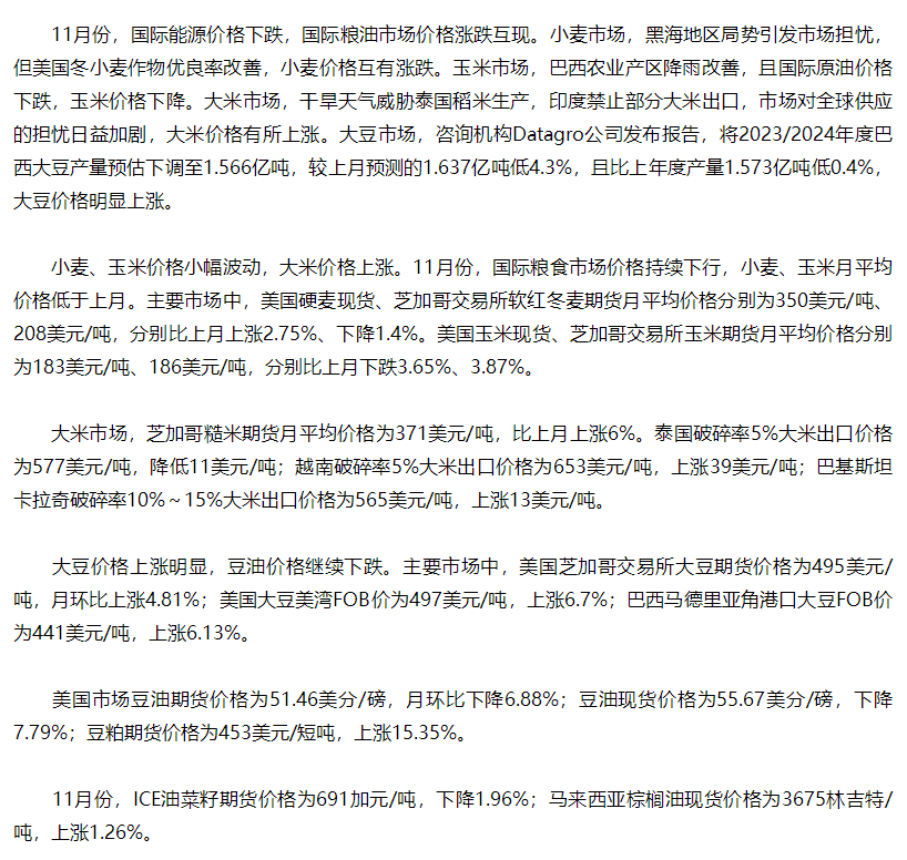 11月份国际粮油市场:大米大豆价涨豆油菜油价跌