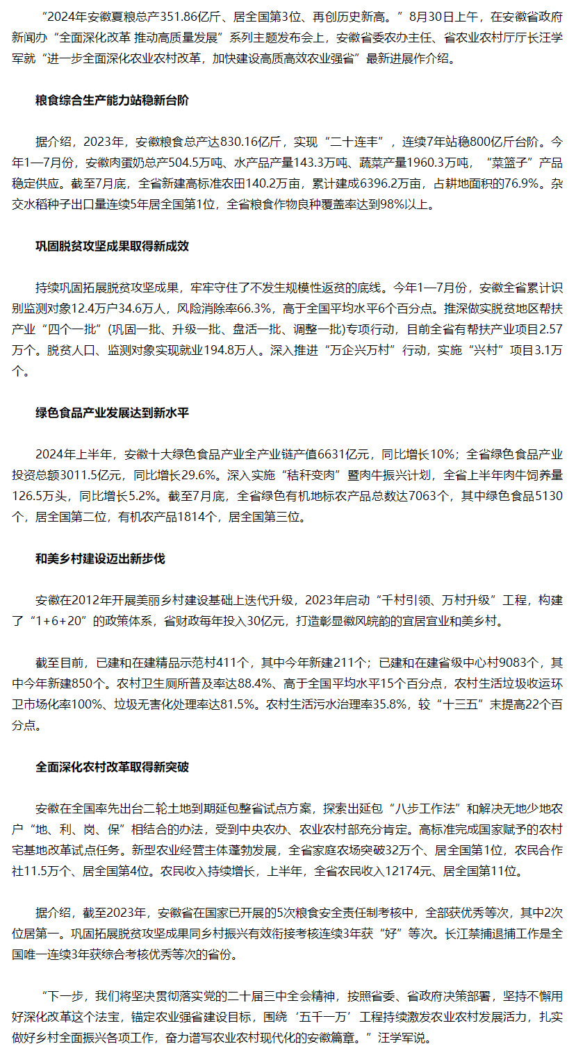 安徽晒“三农”成绩单:粮食连丰产业兴旺乡村和美