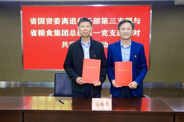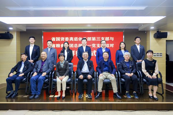 座谈结束,省国资委离退休干部第三党支部与省粮食集团总部第一党支部签订结对共建协议书并合影留念。