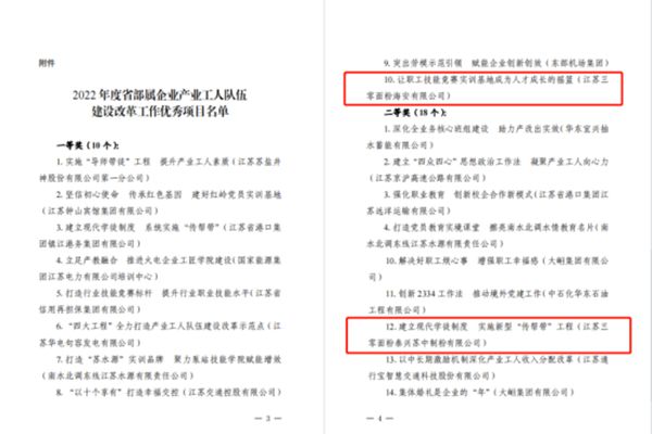 近日,省总工会印发《关于2022年度省部属企业产业工人队伍建设改革工作优秀项目评选结果的通报》,表彰了一批产业工人队伍建设改革工作优秀项目。集团所属江苏三零面粉海安有限公司《让职工技能竞赛实训基地成为人才成长的摇篮》项目荣获2022年度省部属企业产业工人队伍建设改革工作优秀项目一等奖,所属江苏三零面粉泰兴苏中制粉有限公司《建立现代学徒制度,实施新型“传帮带”工程》项目荣获二等奖。